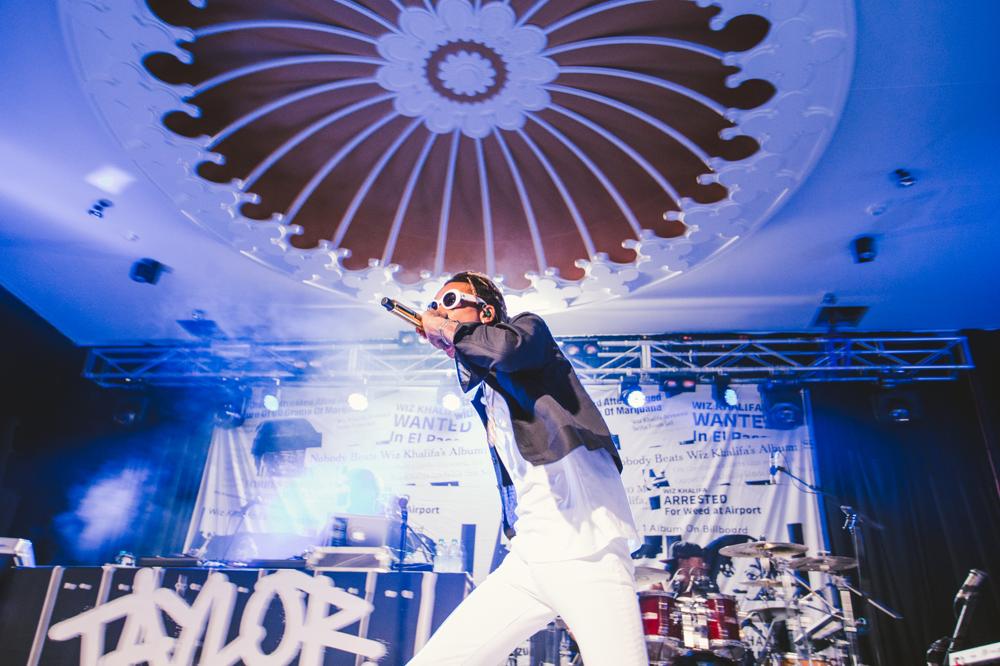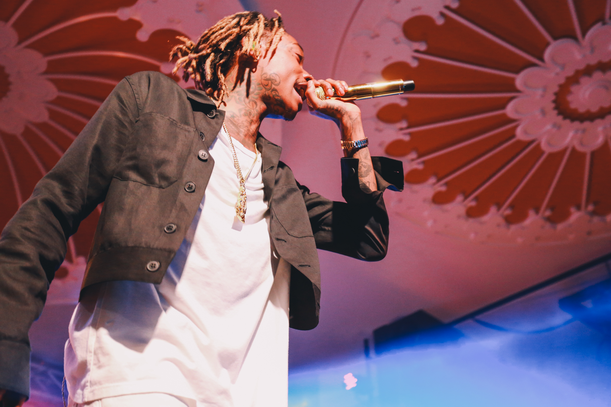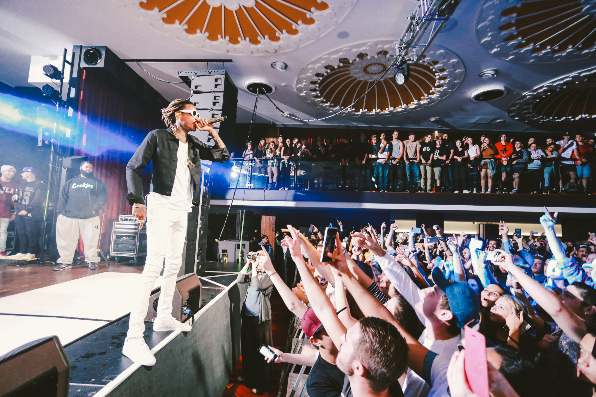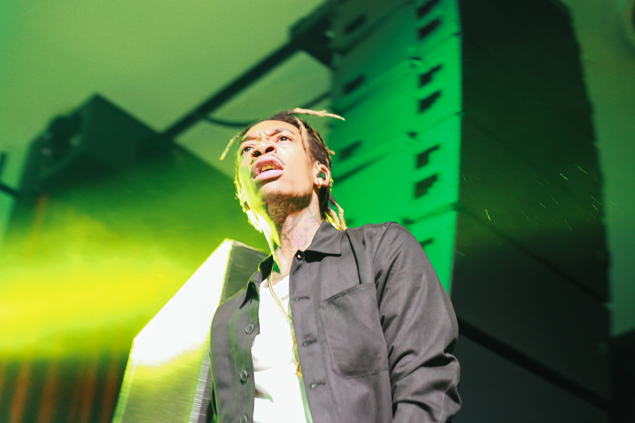 A live band joined Wiz on stage with a backdrop profiling multiple articles addressing his recent drug-related arrests and chart successes. Wiz brought energy into the room as he bounded around the stage, throwing up gang signs and lobbing bottles of water into the crowd. A strong connection was formed between Wiz and his fans as he shook hands, stood on sound equipment and posed for pictures. No one was left disappointed as he concluded his set with his most recent No.1 hit single; See You Again which tributes to the late Paul Walker and features on the Fast and Furious 7 soundtrack.