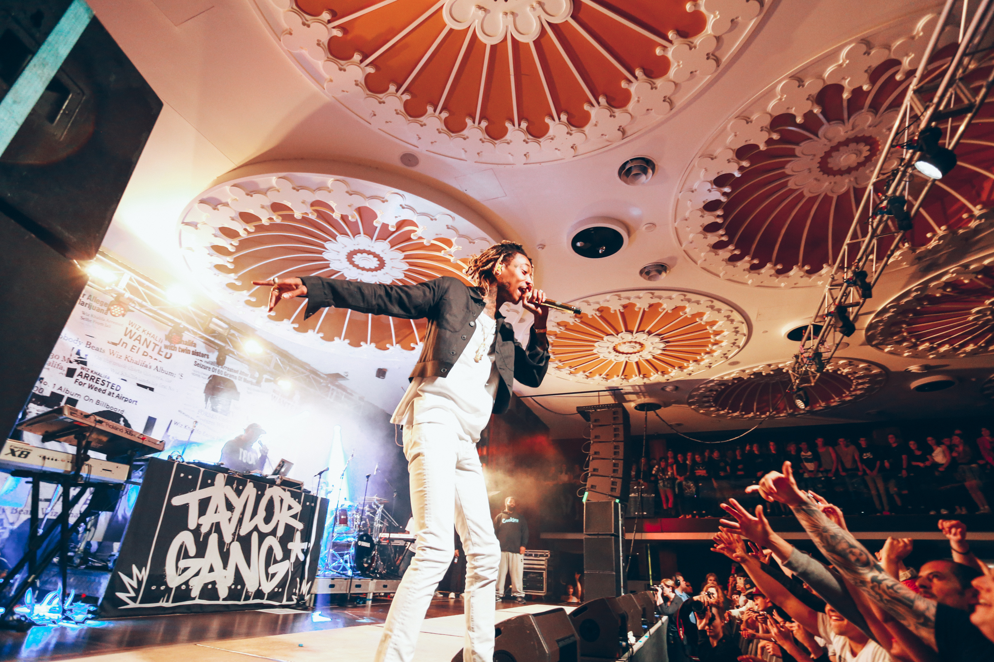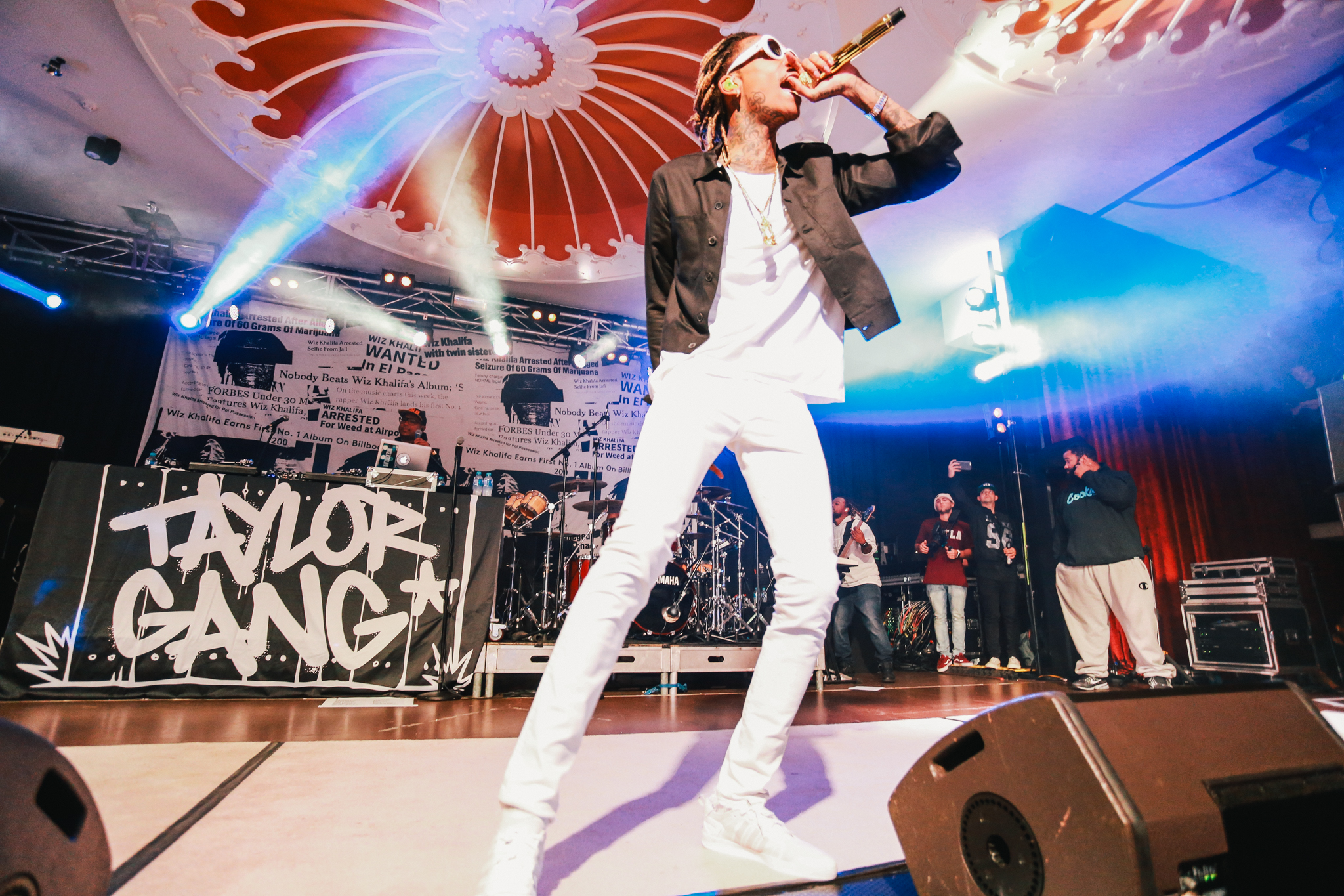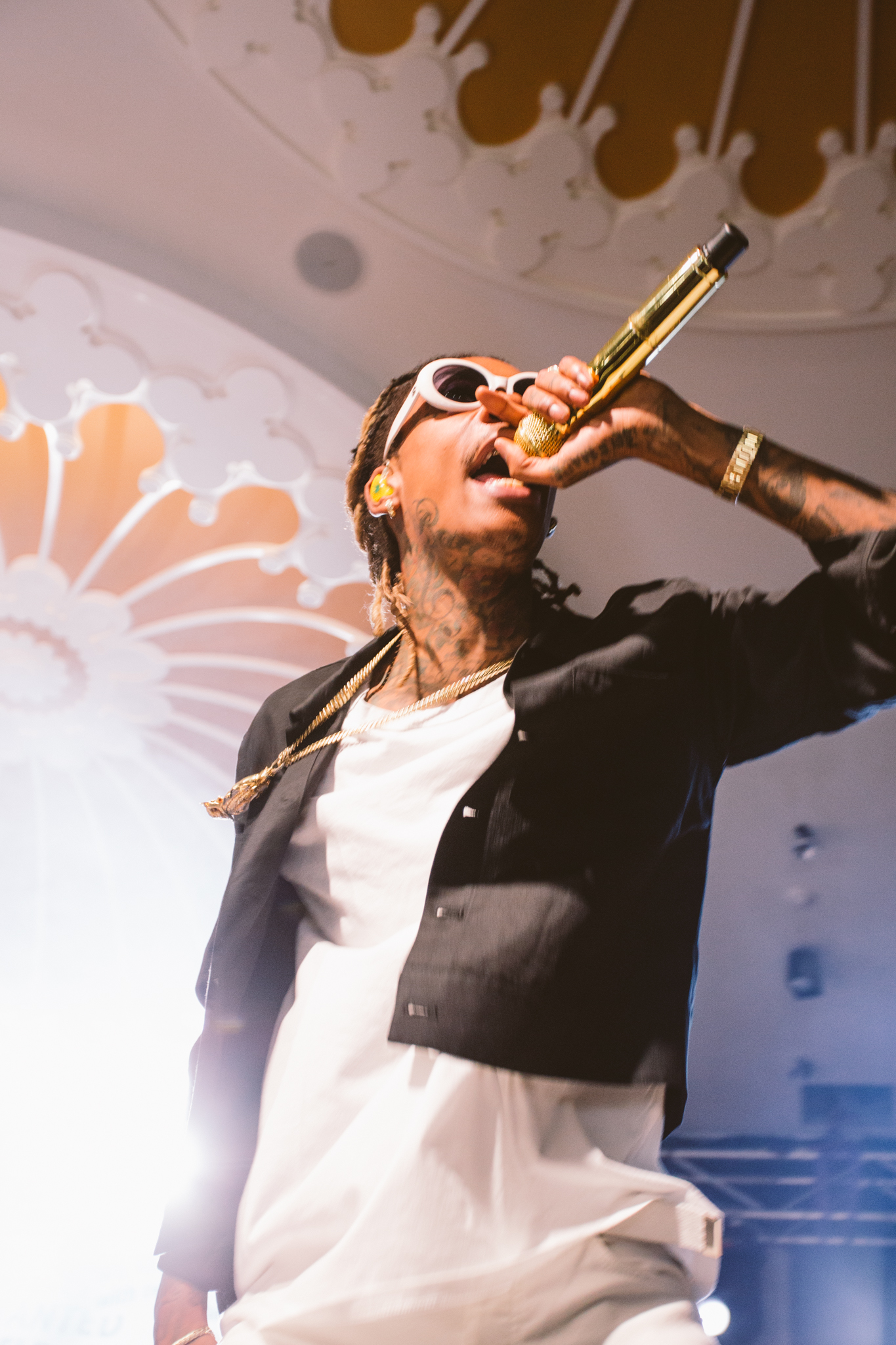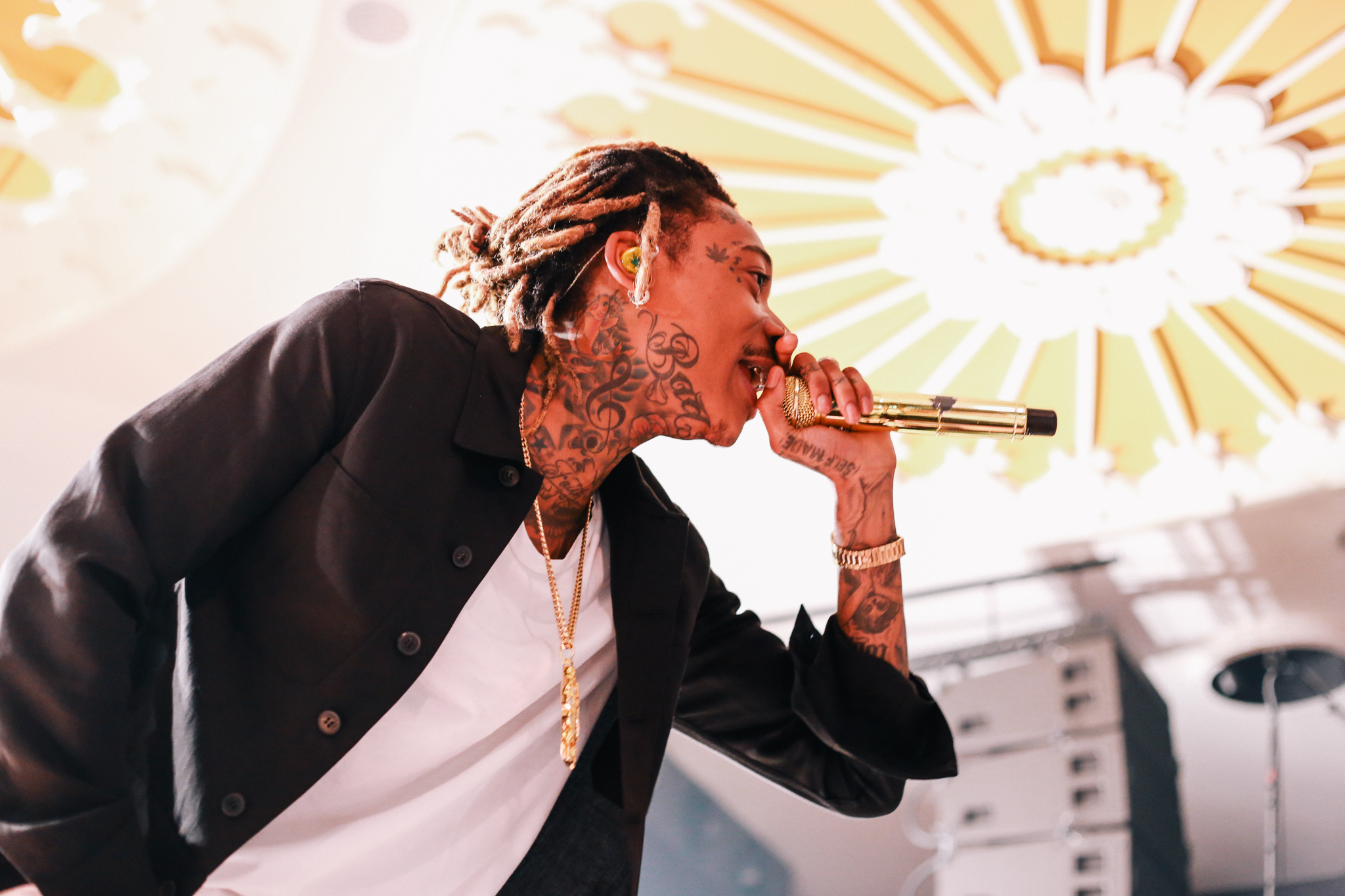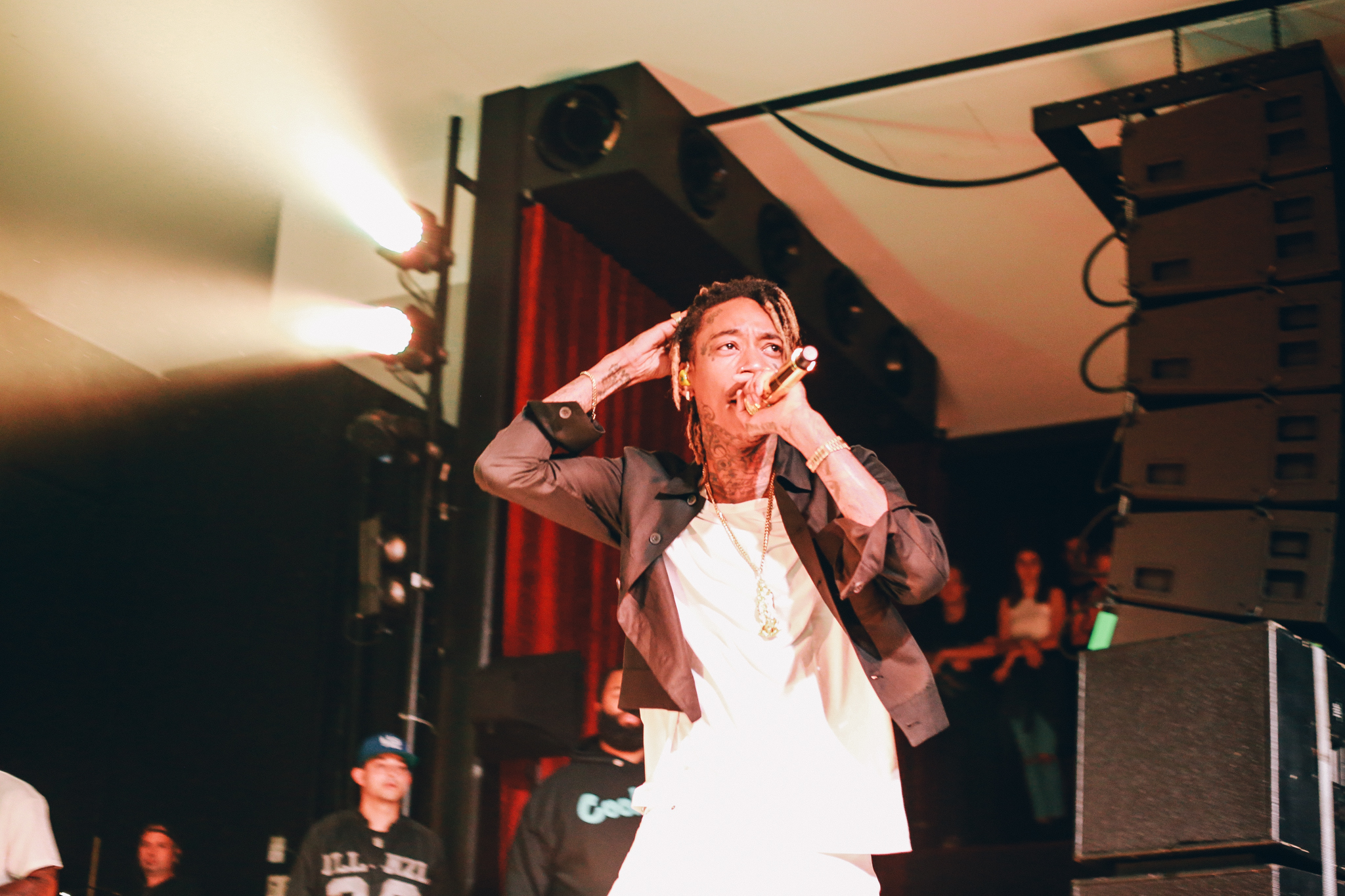 A live band joined Wiz on stage with a backdrop profiling multiple articles addressing his recent drug-related arrests and chart successes. Wiz brought energy into the room as he bounded around the stage, throwing up gang signs and lobbing bottles of water into the crowd. A strong connection was formed between Wiz and his fans as he shook hands, stood on sound equipment and posed for pictures. No one was left disappointed as he concluded his set with his most recent No.1 hit single; See You Again which tributes to the late Paul Walker and features on the Fast and Furious 7 soundtrack.