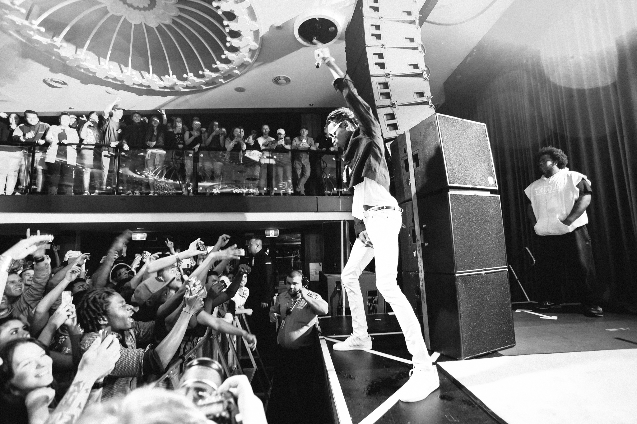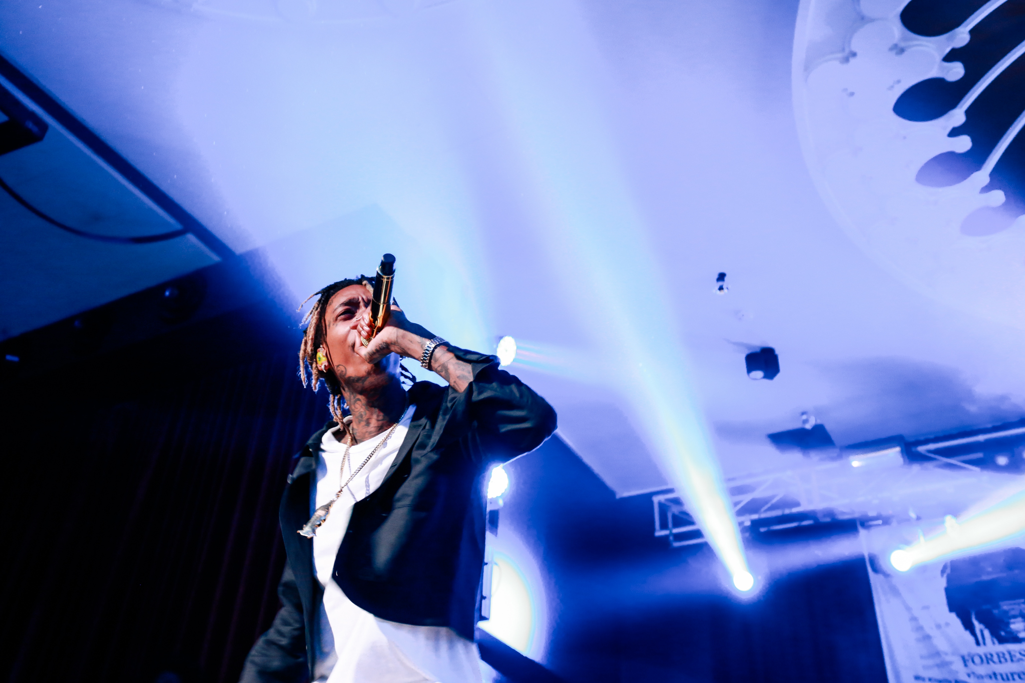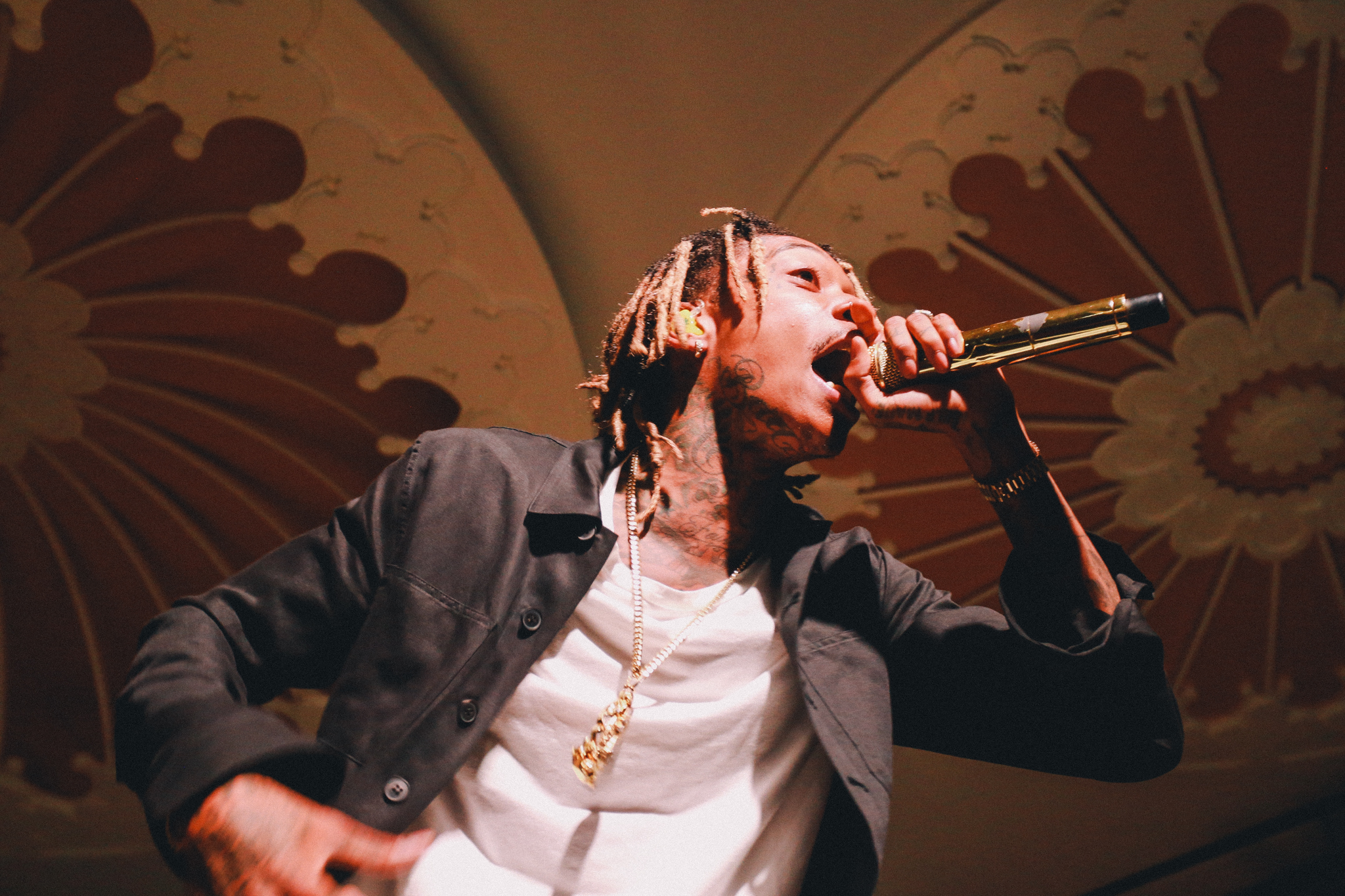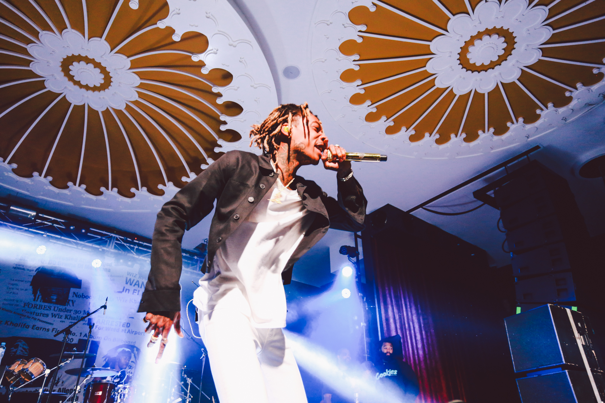 A live band joined Wiz on stage with a backdrop profiling multiple articles addressing his recent drug-related arrests and chart successes. Wiz brought energy into the room as he bounded around the stage, throwing up gang signs and lobbing bottles of water into the crowd. A strong connection was formed between Wiz and his fans as he shook hands, stood on sound equipment and posed for pictures. No one was left disappointed as he concluded his set with his most recent No.1 hit single; See You Again which tributes to the late Paul Walker and features on the Fast and Furious 7 soundtrack.