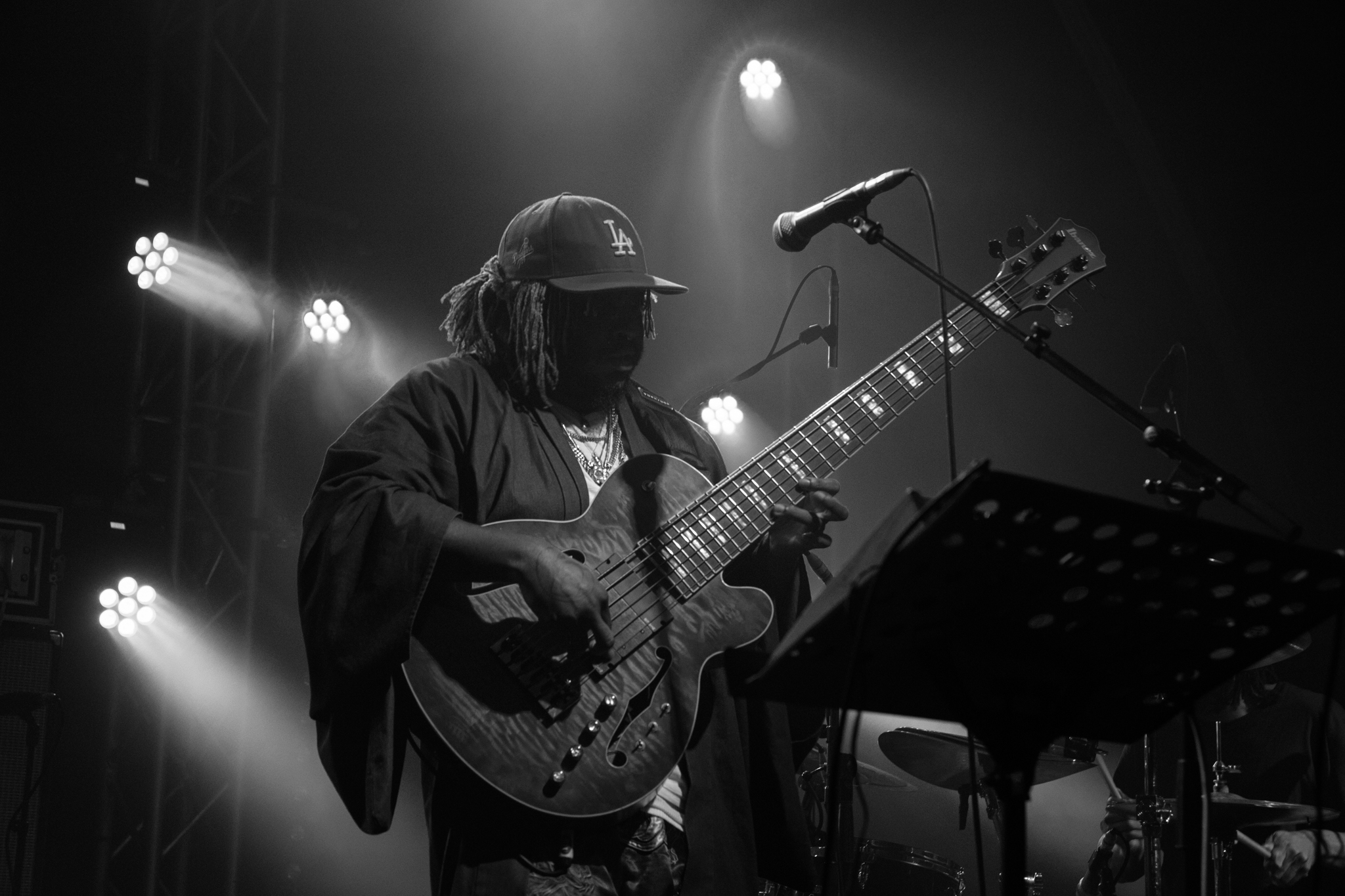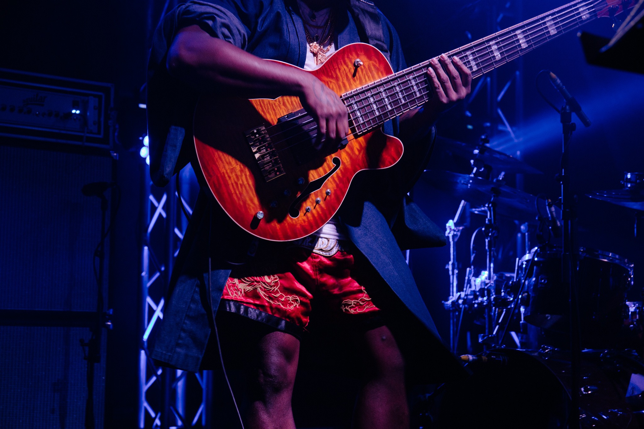 Justin Brown drums like a contortionist in Song for the Dead and punchy, acidic basslines follow in a rendition of Kendrick Lamar’s Complexion featuring a fantastic solo which saw Thundercat bathed in a angelic blue spotlight as if he was some kind of bassist from heaven.