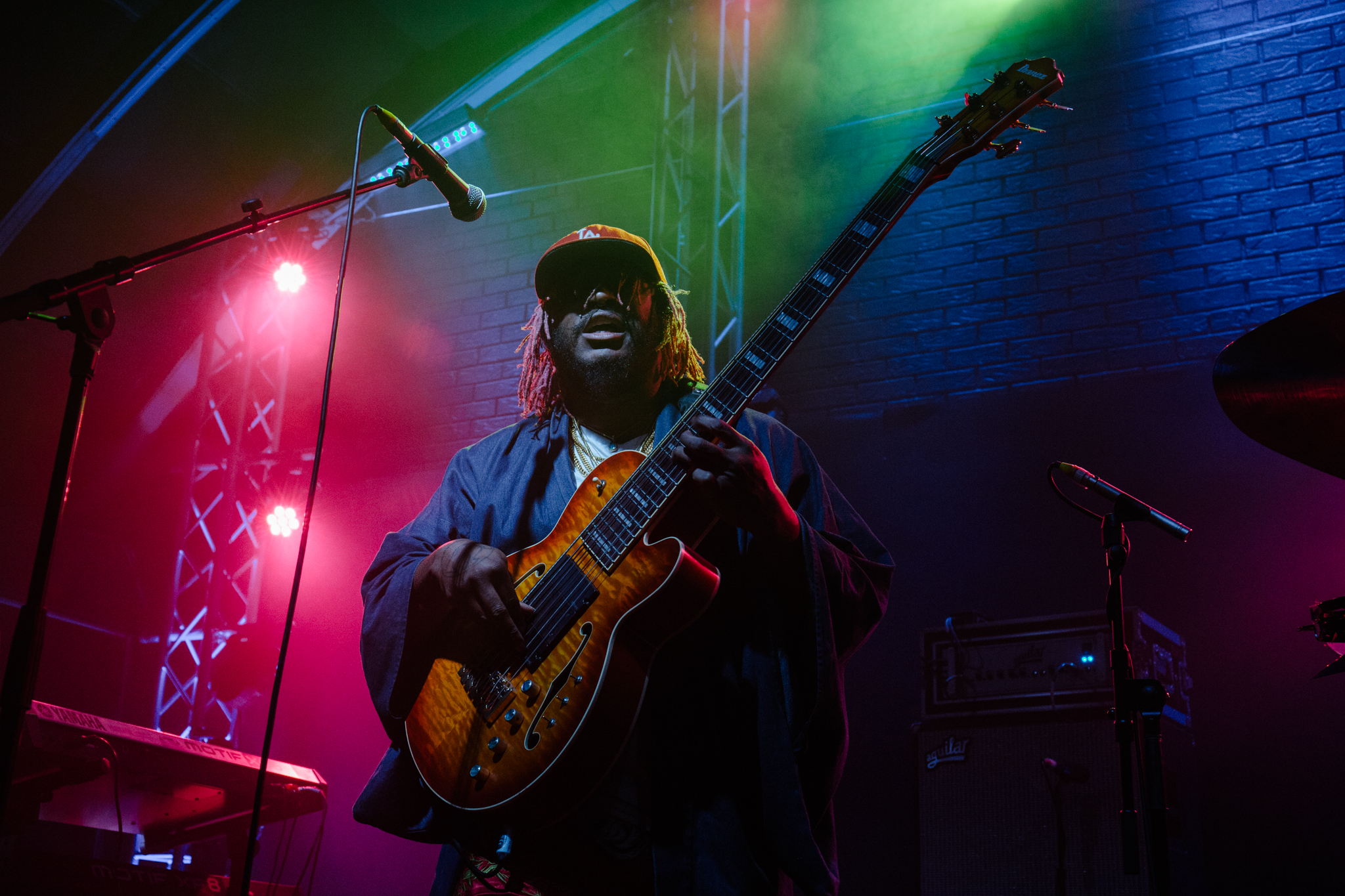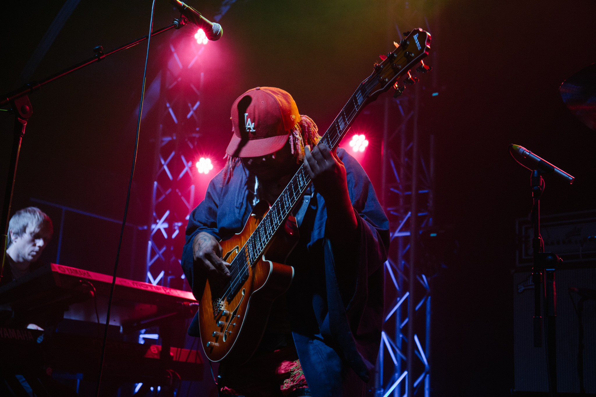 From the get-go the show had an energy and pace that was honestly mesmerising. Thundercat’s fingers moved up and down the frets with ease, his six-string bass giving him the ability to play it like an electric guitar and his pedalboard helping to produce sounds that were completely unexpected. One second the guitar sounded like a bass, the next it was a keyboard and the next it was something else that who knows what. The sound of his guitar was something I have never experienced and there were moments where my brain struggled to comprehend the crescendo of noises that were coming out of it. Thundercat and his band were focused and energised, the opening song Captain Stupido was a statement of things to come – Brown playing the drums unbelievably fast, it’s deformed cymbals an indicator that he was serious business and Hamm playing two keyboards simultaneously as if it were nothing.