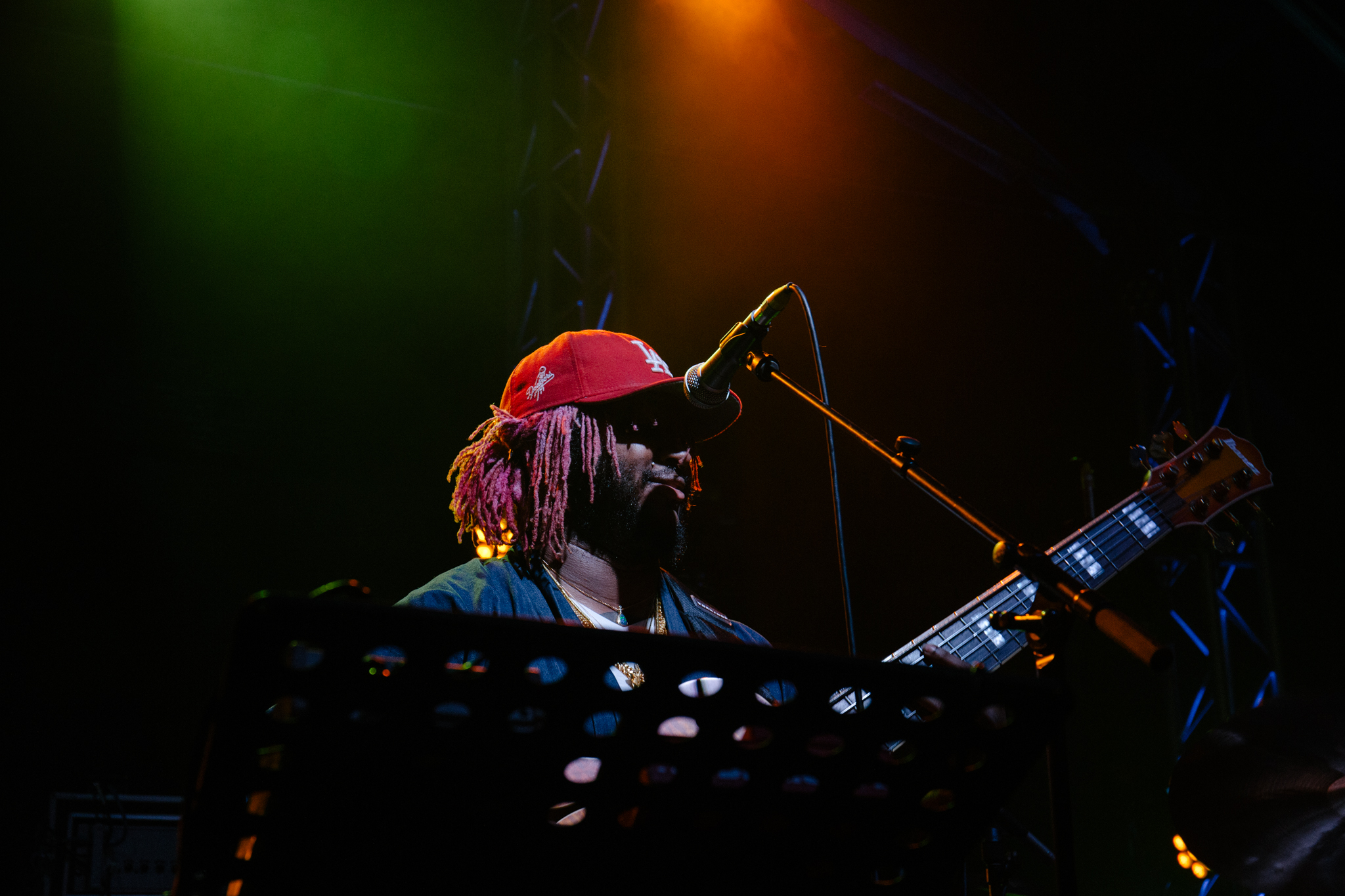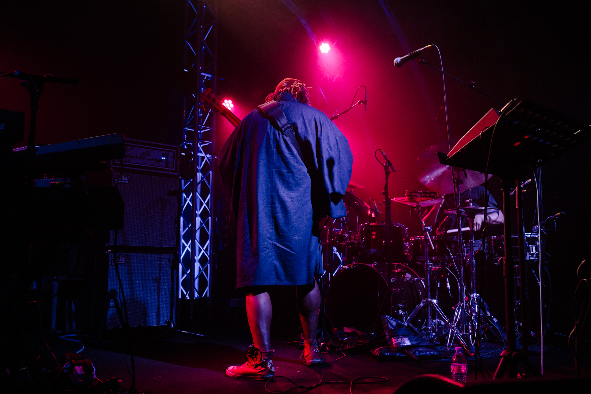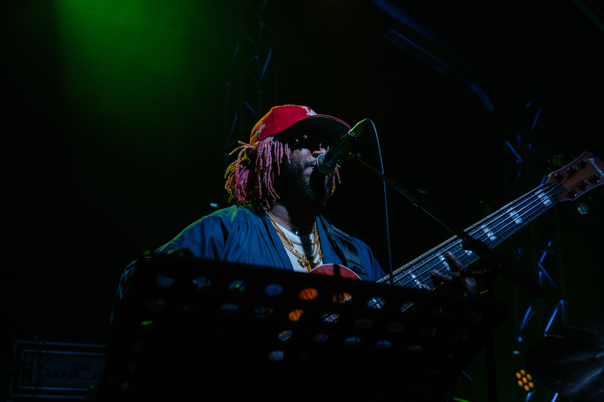 Thundercat appeared with pink hair and dressed in a dark robe; the image complete with his comically massive orange Ibanez six-string bass. His band consisted of Justin Brown on drums and Dennis Hamm on keys, who later both proved themselves a marvelous accompaniment to Thundercat’s insane stage presence.